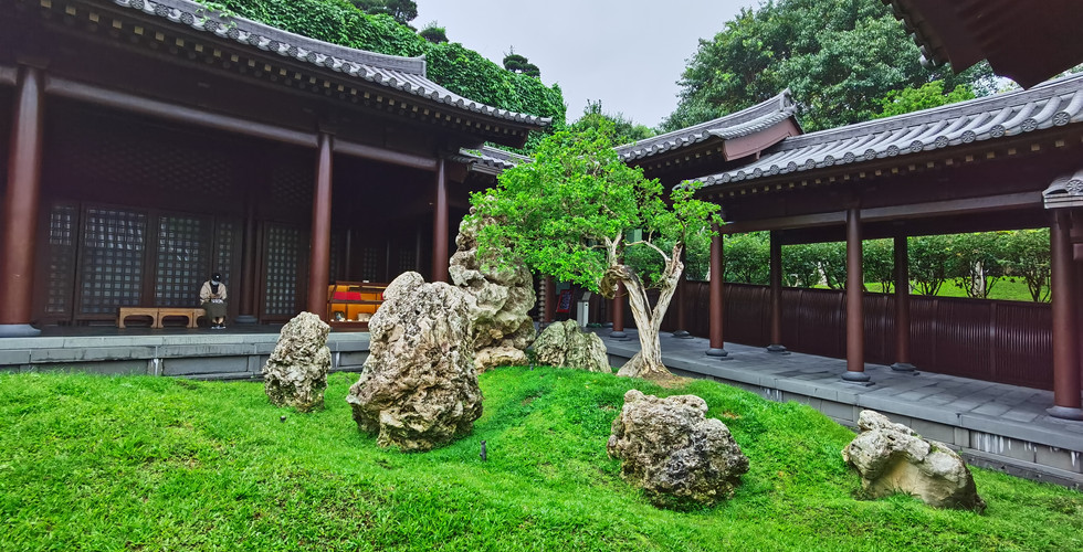 Just past the Lotus Pond on the south side of the garden is Xiang Hai Xuan (meaning a house embracing a sea of fragrance) flanked on one side by Fragrance Hill with its sweet-scented trees including osmanthus, lily and orange-jasmine. Xuan is fronted by a central courtyard in Tang Style with Ying Shan roofs made of grey tiles and surrounded by a quadrangle with green lawn, ancient trees and rocks. The inner room contains a multi-purpose hall which is hired out for art exhibitions, musical performances and seminars etc.